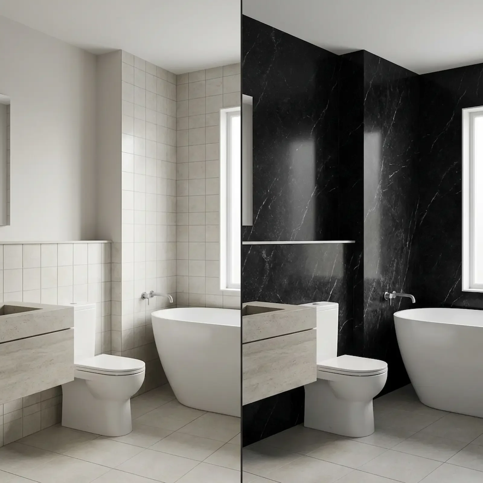 Votre salle de bain retrouve un aspect moderne et homogène, avec des finitions minérales haut de gamme et un rendu durable.